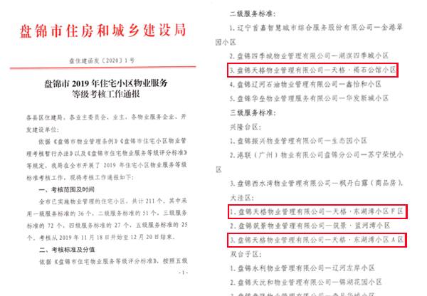 天格物業(yè)榮獲2019年遼寧省物業(yè)行業(yè)優(yōu)秀會員單位榮譽稱號;2020年遼寧省房地產(chǎn)行業(yè)協(xié)會第六屆理事會副會長單位;“天格褐石公館”項目榮獲2020年遼寧省物業(yè)服務(wù)標(biāo)桿項目和2020年度盤錦市物業(yè)管理優(yōu)秀住宅小區(qū)。